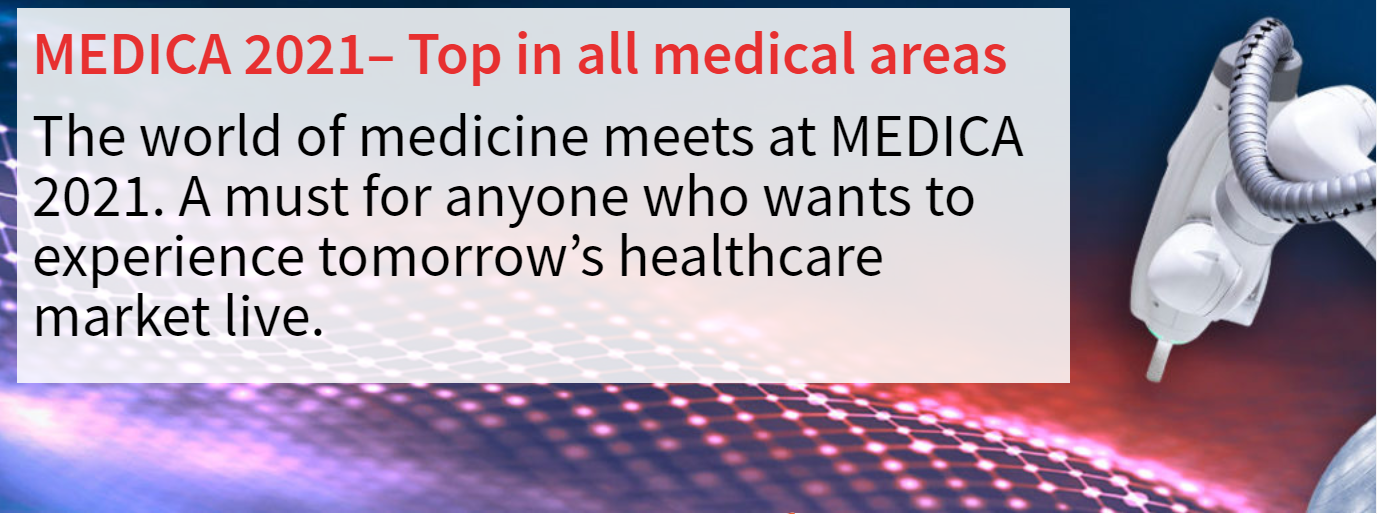 Delve into the world of medical technology! The whole industry will meet at MEDICA in Düsseldorf from 15 – 18 November 2021. Experience high-tech products, meet world market leaders, hidden champions and start-ups or visit the top-class forums and conferences. Regardless what you are looking for: you will find it at MEDICA 2021!