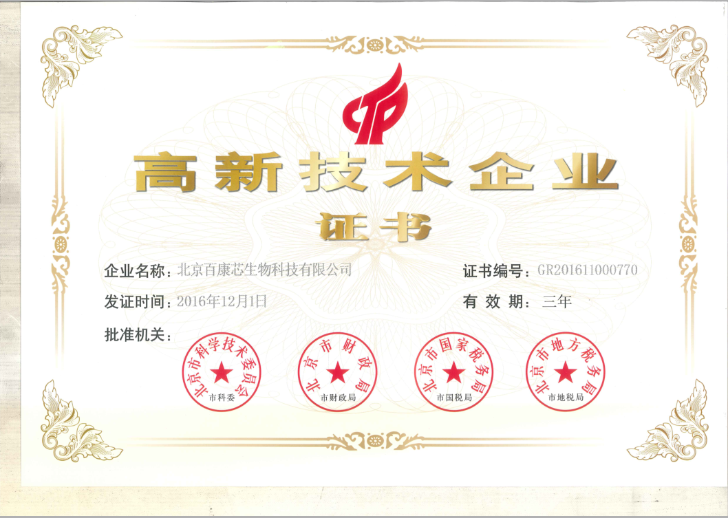 北京百康芯生物科技有限公司于2016年12月1日榮獲北京市科學(xué)技術(shù)委員會、北京市財政局、北京市國家稅務(wù)局、北京市地方稅務(wù)局聯(lián)合頒布的高新